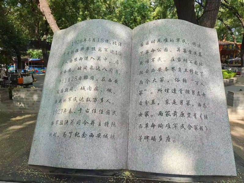 眼前翻开状的石碑,静静诉说 1926 年西安被围的苦难与抗争。那段被战火炙烤的岁月里,数万人的牺牲,换来了守城胜利的曙光,也让“革命公园”的意义,厚重如磐。